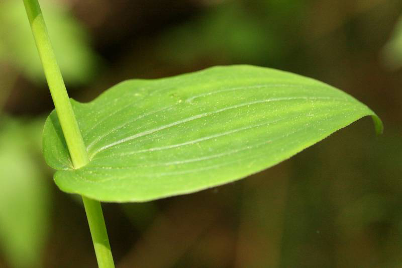The leaves are alternate along the stems and are oval to oblong-lanceolate in shape with parallel venation. Leaves are glaucous beneath and the margins are either entire or minutely toothed. They measure 5-15 cm long and 3-7 cm wide. The stalk less leaves clasp the stem at their bases (Those of rosy twisted-stalk do not clasp the stem.). Basal leaves are lacking. The lower surface of the leaves have a dull grayish-green color covered in a waxy bloom.