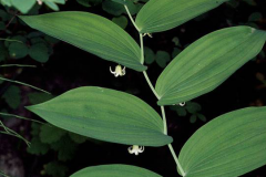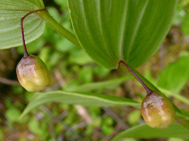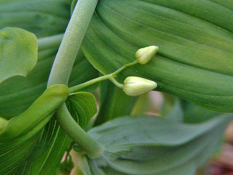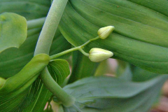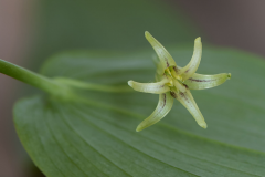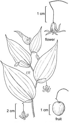 The flowers droop from leaf axils, hanging on thin, sharply bent stalks from 9-15 mm long. The flower stalk is jointed and abruptly bent or kinked. They consist of a small gland at the bend. Flowers are white and greenish-tinged, bell-shaped (usually single), consisting of six bell-shaped tepals 9-15 mm long. Tepals are oblong-lanceolate, concavely tapering to long, pointed, spreading or bent-back tips. The 6 stamens are of unequal length, the innermost longer than the outer stamens. Each flower has one 3-chambered pistil. The flowers are typically hidden under the leaves and may go unseen. Flower stalks are up to 2 inches long, wiry and bent or twisted.