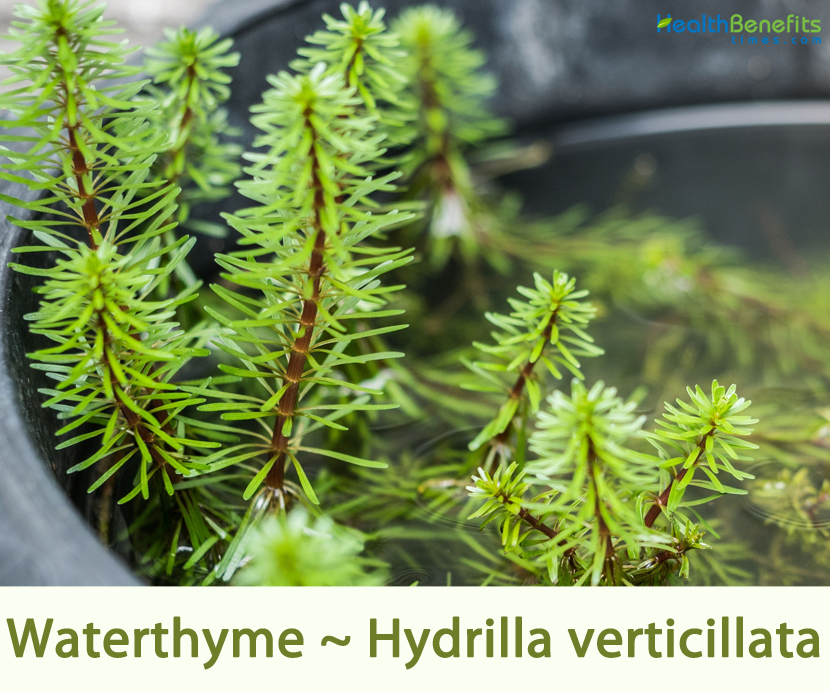 Waterthyme (Hydrilla) is a slender, submerged fast-growing, monoecious or dioecious perennial aquatic herb that normally grows up to 200 cm long. The plant is found growing in freshwater, springs, lakes, marshes, ditches, rivers, tidal zones, ponds, impoundment canals, streams, bayous and reservoirs. Similarly it can be grown in a variety of aquatic habitats, from acidic to basic, oligotrophic to eutrophic, fresh to brackish, and from a few centimeters deep to a meter or more if light penetrates that deeply. It thrives on many kinds of pollution and tolerates a great deal of disturbance. The roots are long, slender and unbranched. They develop ovoid tubers at the tips. Tubers are tough, off white to brown-black, and 4-19 mm long.