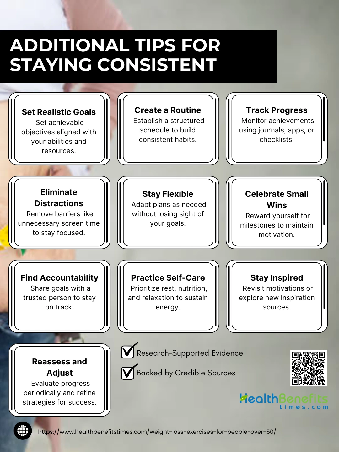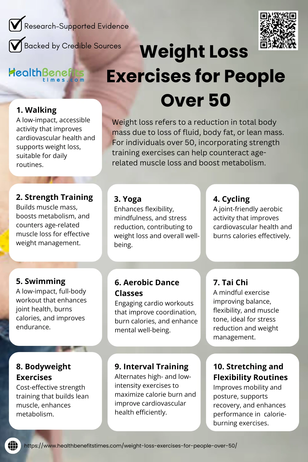 Incorporating these ten weight loss exercises into a consistent fitness routine can significantly enhance health, mobility, and overall quality of life for people over 50. From low-impact activities like walking and swimming to more targeted methods such as strength training and interval workouts, each exercise offers unique benefits tailored to the needs of older adults. Flexibility and mindfulness practices like yoga and Tai Chi not only improve physical balance but also promote mental clarity and reduce stress. Additionally, the adoption of structured routines and realistic goal-setting ensures sustained motivation and long-term success. By embracing these practices and maintaining consistency through gradual progression and self-accountability, individuals over 50 can achieve their weight loss goals while building a healthier, more active lifestyle.