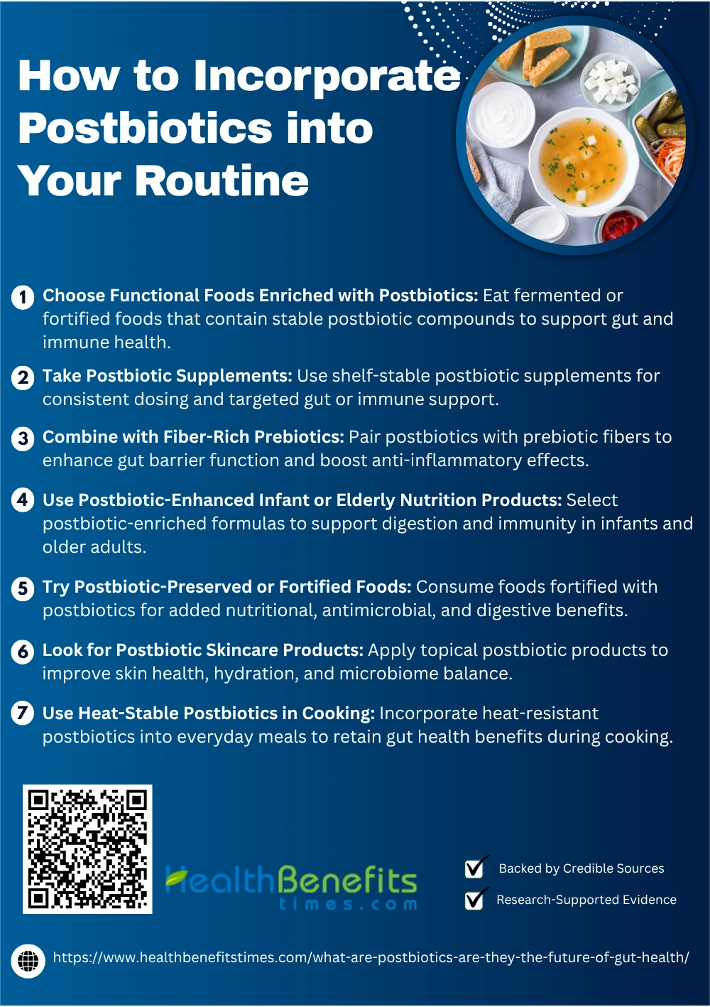 Incorporating postbiotics into your routine is simple through diet and supplements. Choose fermented foods, labeled postbiotic products, or consult a healthcare provider for targeted options to support gut and immune health.