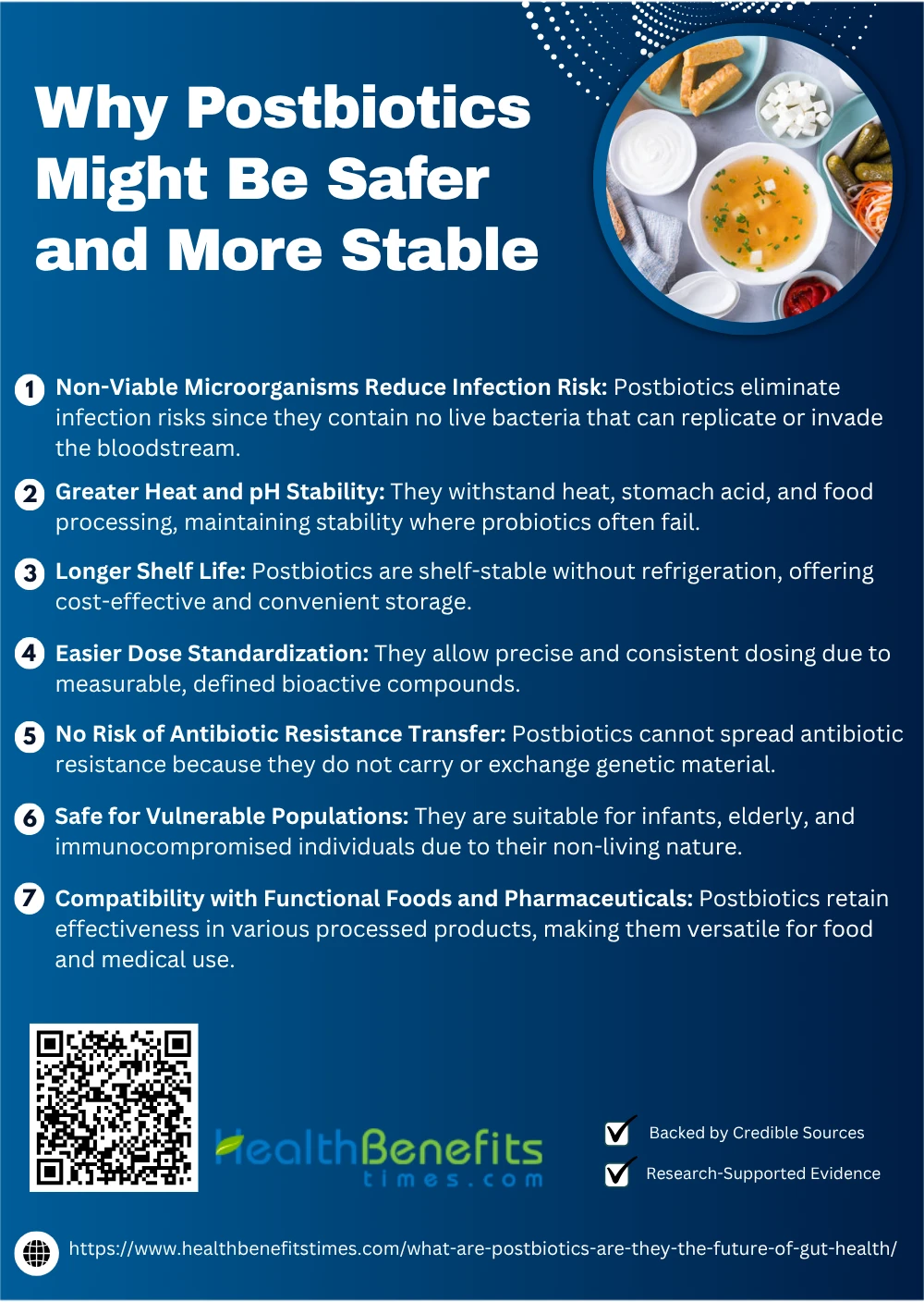 Unlike probiotics, postbiotics are not live microorganisms and thus do not require survival through gastrointestinal transit to be effective. This key distinction makes them more stable, easier to store, and safer for immunocompromised individuals (Nataraj et al., 2020). Because they are non-viable, postbiotics eliminate the risks associated with live bacteria such as translocation and microbial imbalance in vulnerable populations (Wegh et al., 2019).