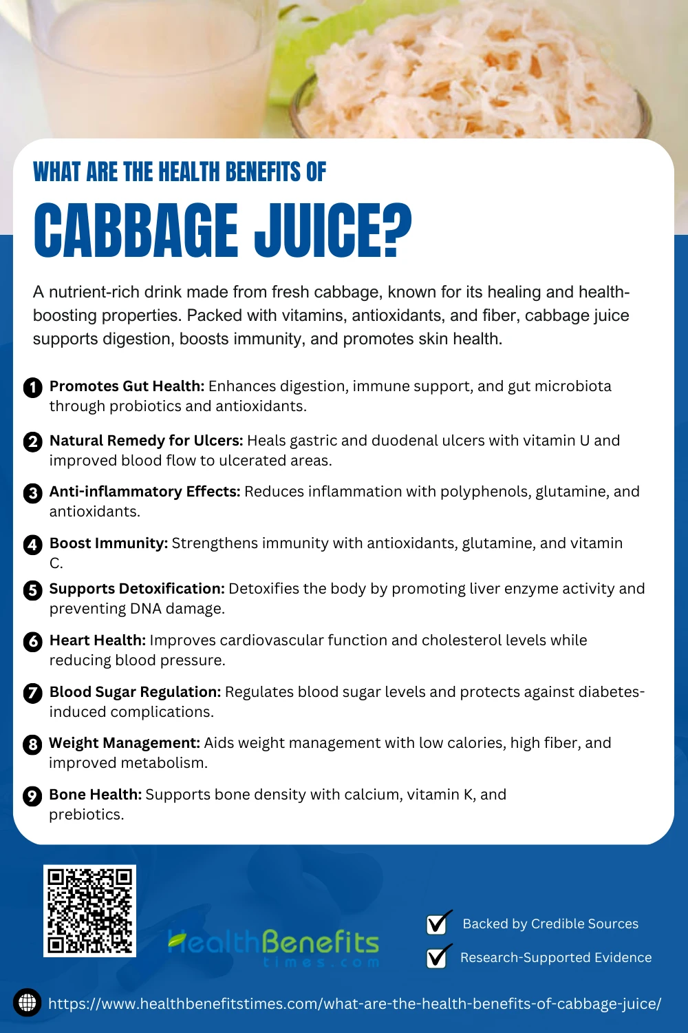 Cabbage juice, derived from fresh or fermented cabbage, is a nutrient-rich beverage packed with vitamins, minerals, and bioactive compounds. It is widely acclaimed for its therapeutic and health-promoting properties, making it a valuable addition to a healthy diet. Research highlights its potential to support gut health through probiotic effects when fermented (1).