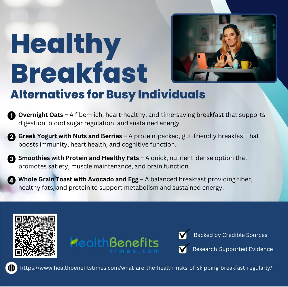 Busy individuals can enjoy quick, nutritious breakfasts like smoothies, overnight oats, yogurt with fruit, or whole-grain toast with protein to maintain energy, focus, and overall health.