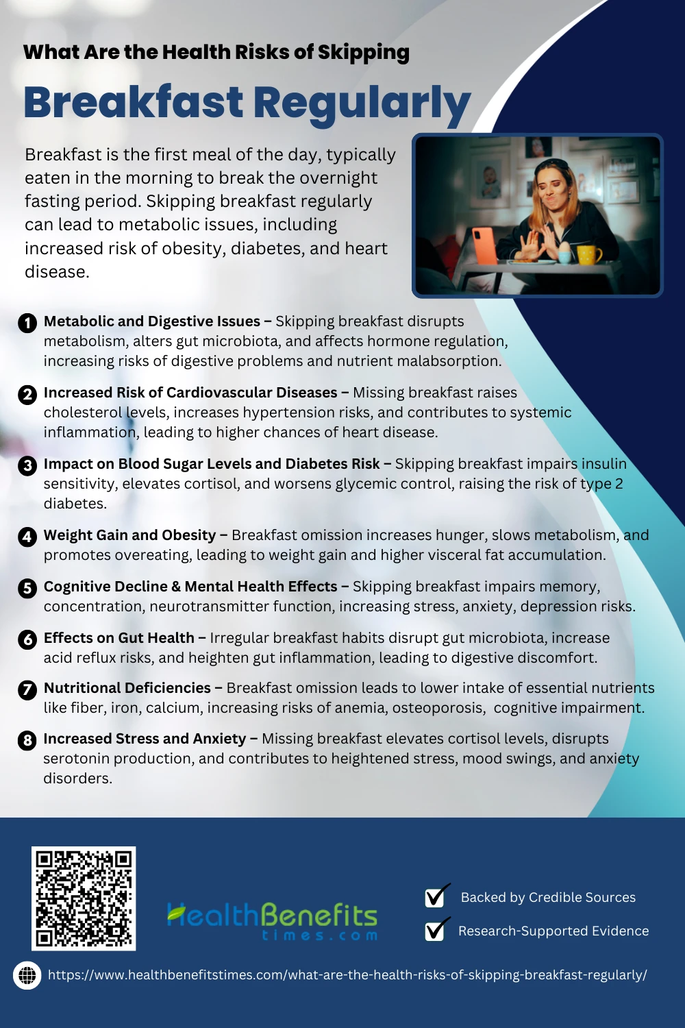 - Skipping breakfast regularly can lead to metabolic issues, including increased risk of obesity, diabetes, and heart disease.