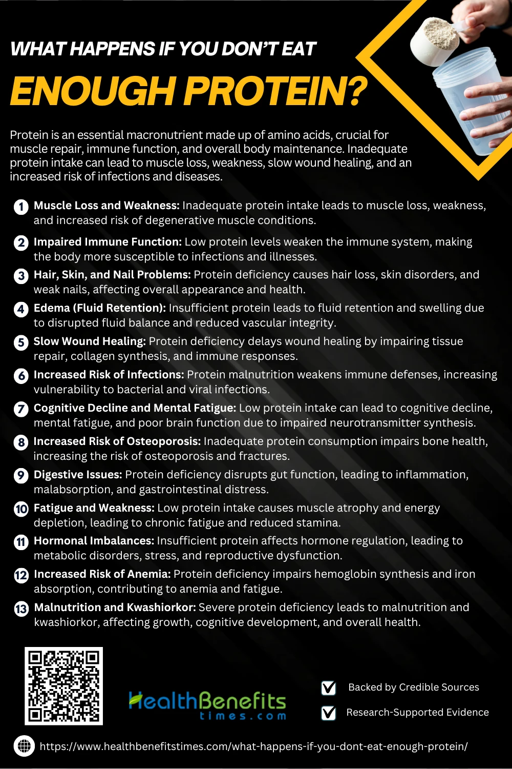 - Inadequate protein intake can lead to muscle loss, weakness, slow wound healing, and an increased risk of infections and diseases.