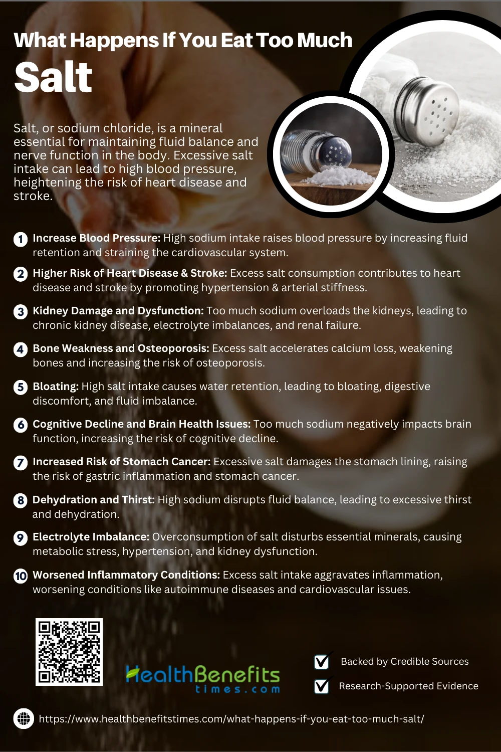 In conclusion, consuming too much salt can have serious repercussions on your health, including elevated blood pressure, increased risk of heart disease, and potential kidney damage. By being mindful of your salt intake and making healthier dietary choices, you can mitigate these risks and promote overall well-being. Incorporating a balanced diet, reading food labels, and opting for natural, low-sodium alternatives are effective strategies to maintain optimal health. Taking proactive steps to control salt consumption not only supports your immediate health but also contributes to long-term vitality and a higher quality of life.
