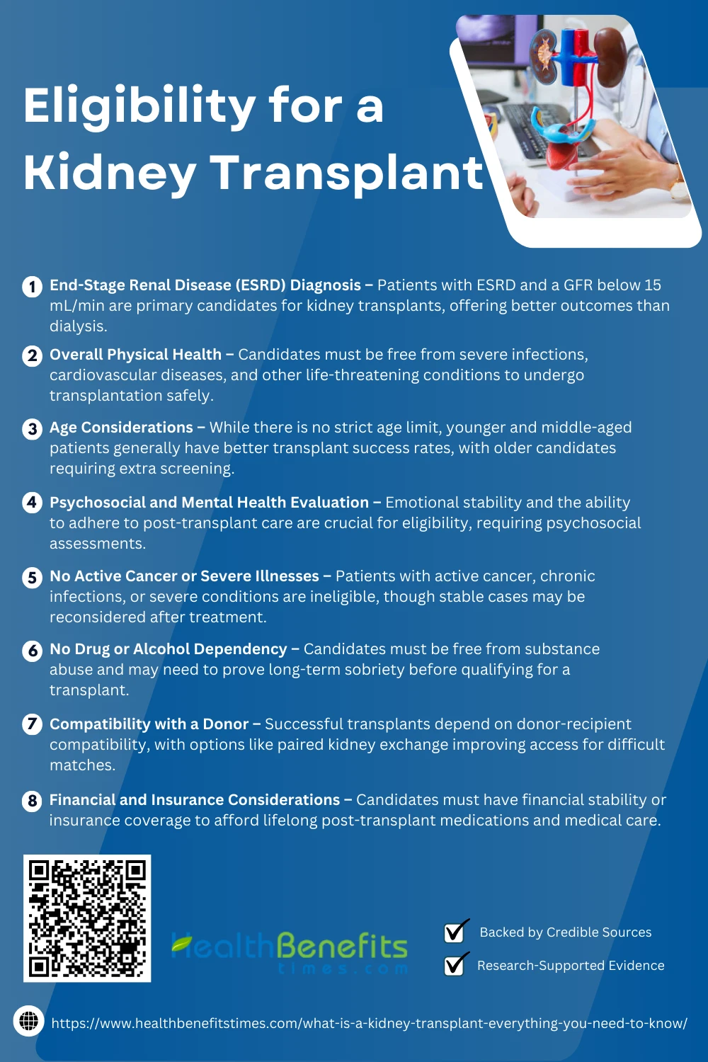 Eligibility for a kidney transplant depends on medical, lifestyle, and psychological factors. Doctors assess overall health, organ compatibility, and potential risks to determine if a patient qualifies for this life-saving procedure.
