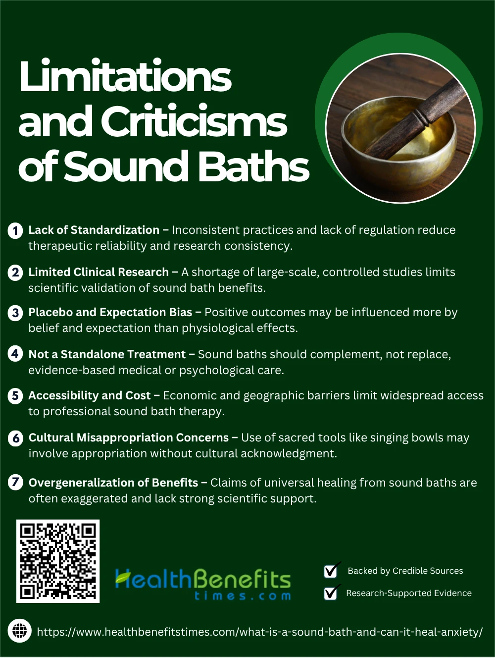 While sound baths offer relaxation benefits, they’re not a substitute for medical treatment. Critics point to limited scientific evidence, potential sensory discomfort, and varied personal responses as notable limitations.
