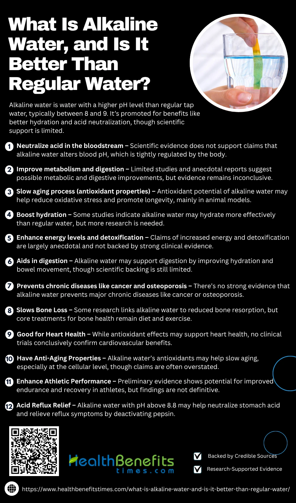 - It’s promoted for benefits like better hydration and acid neutralization, though scientific support is limited.