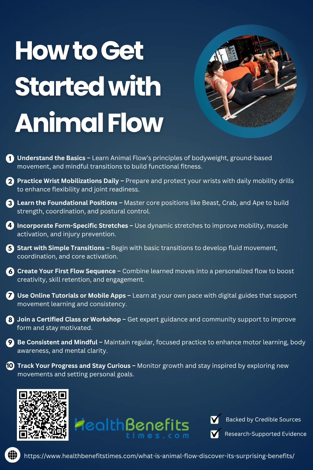 Getting started with Animal Flow is simple and accessible. With no equipment needed, you can begin practicing foundational moves at home, follow online tutorials, or join certified classes for guidance.
