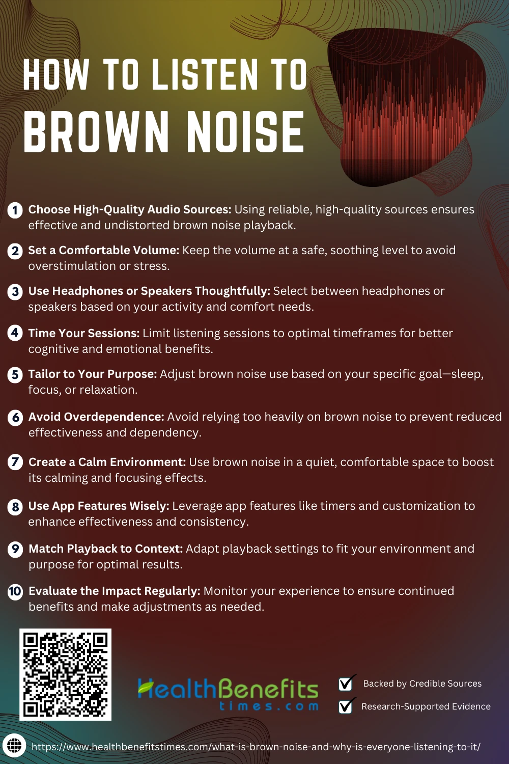 Listening to brown noise is easy with apps, streaming platforms, or YouTube. Use headphones or speakers in a quiet space to enhance focus, relaxation, or sleep depending on your needs.