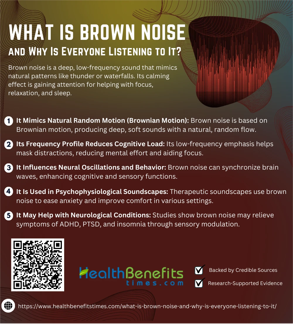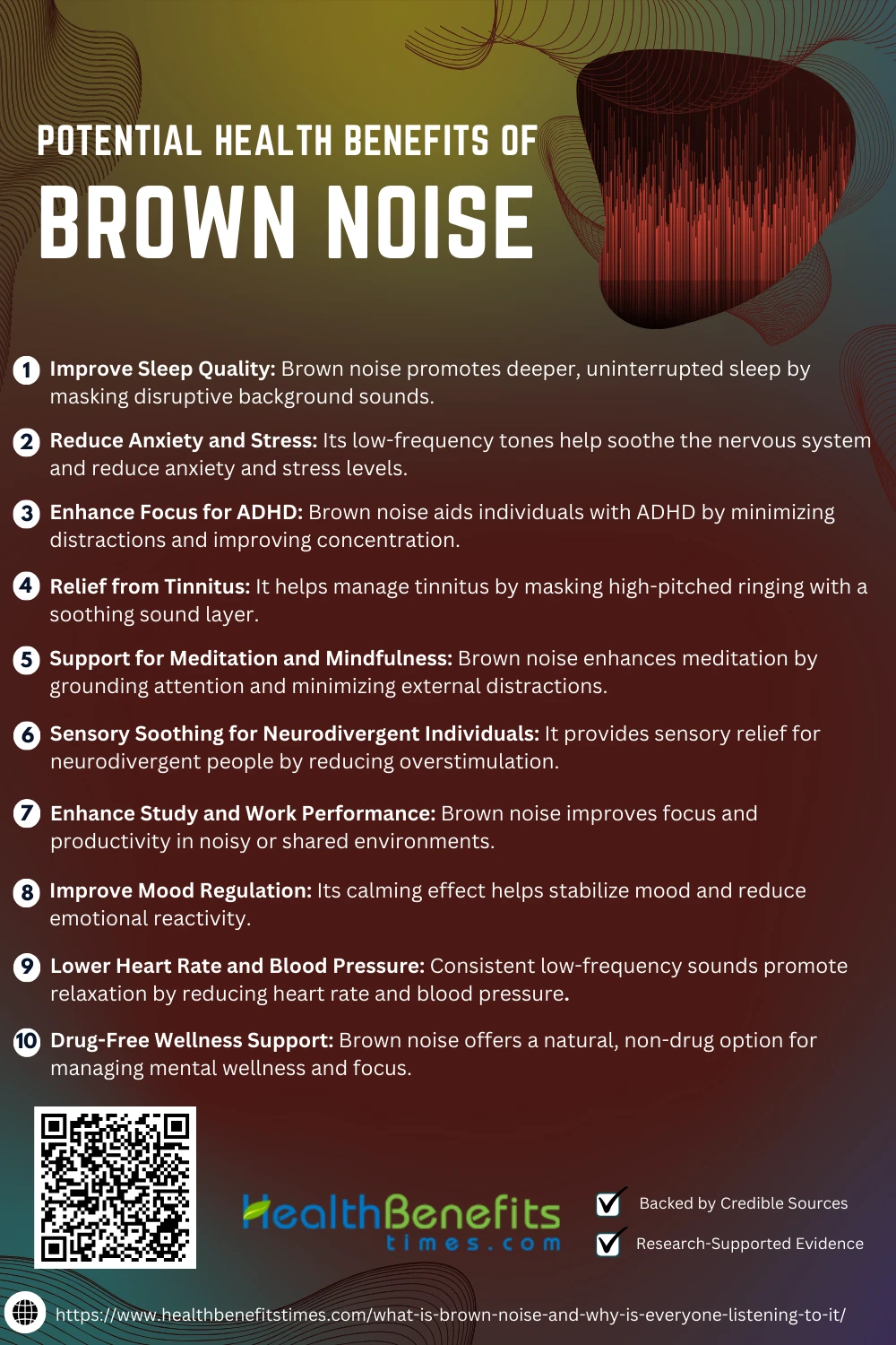 Brown noise may offer several health benefits, including stress relief, enhanced focus, improved sleep, and support for ADHD. Its soothing, low-frequency sound promotes calmness and mental clarity naturally.