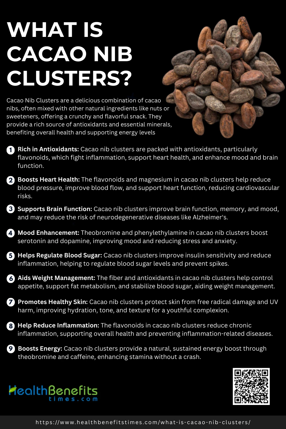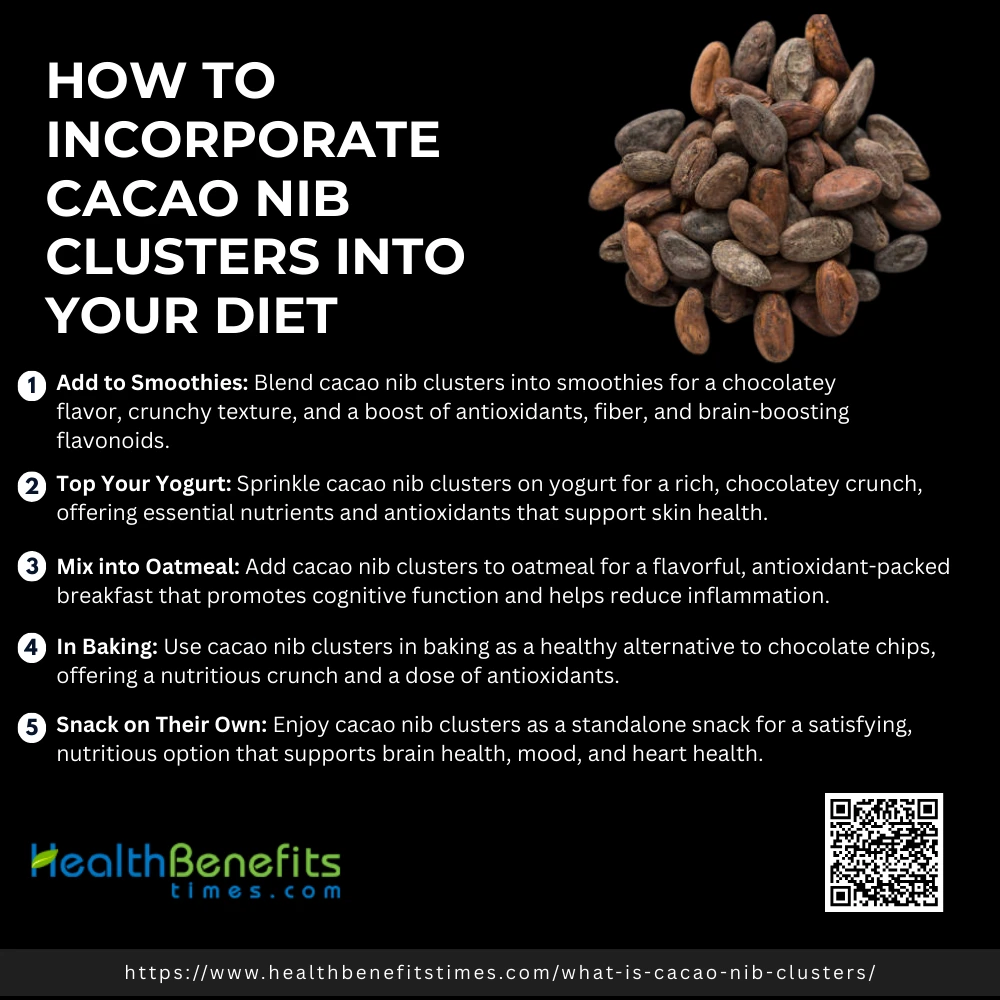 Cacao nib clusters offer numerous health benefits, including antioxidant properties, improved heart health, enhanced cognitive function, and mood-boosting effects, making them a perfect, nutritious snack for overall well-being.
