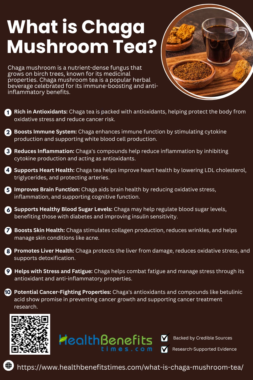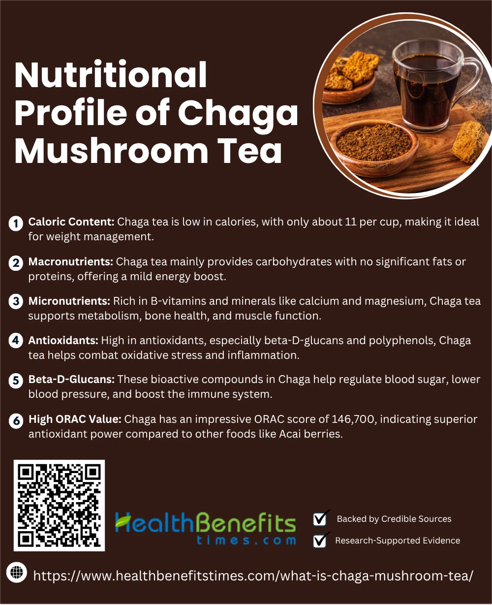 In conclusion, Chaga mushroom tea is a potent herbal beverage known for its rich nutritional profile and health benefits. With its high antioxidant content, it supports immune function, reduces inflammation, and promotes overall wellness. The versatility of Chaga tea, available in various forms and flavors, makes it accessible for different preferences. While generally safe for most, it’s important to be mindful of potential side effects, especially for individuals with certain health conditions or those on medications. Whether enjoyed for its taste or its therapeutic properties, Chaga mushroom tea can be a valuable addition to a health-focused lifestyle.