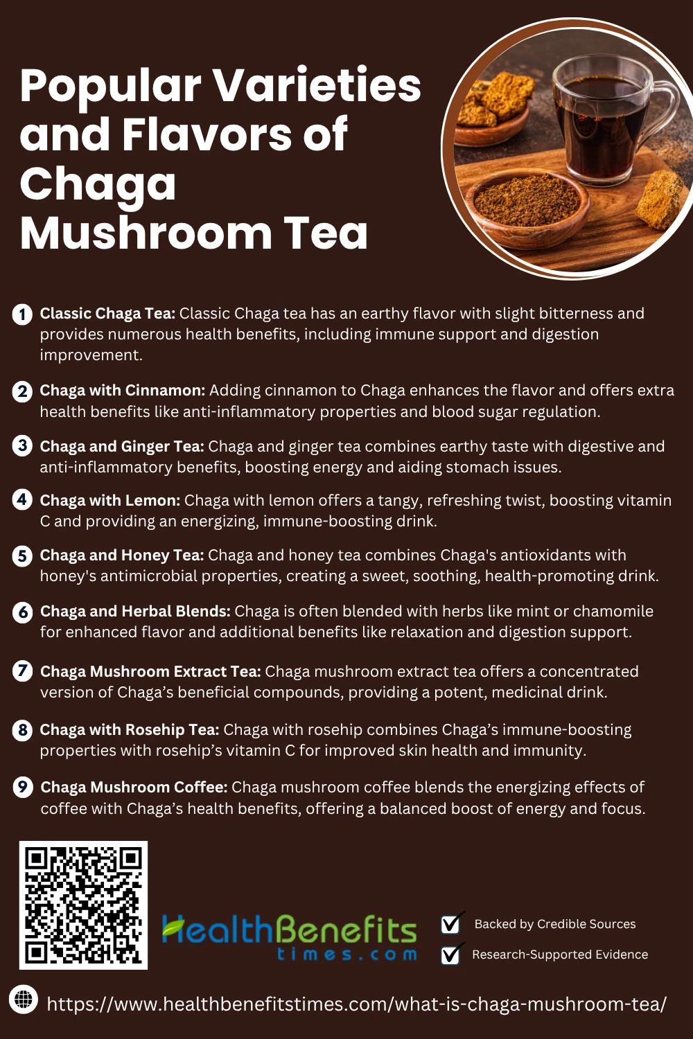Chaga mushroom tea comes in various forms, including loose leaves, tea bags, and powdered versions. It is often combined with other herbs or mushrooms, offering diverse flavors to enhance its health benefits.