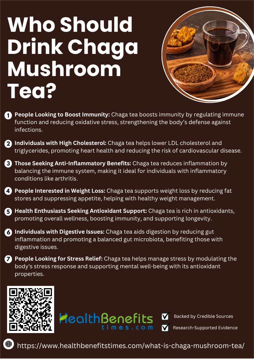 Chaga mushroom tea is ideal for health-conscious individuals, herbal tea enthusiasts, and those seeking immune support. It’s also beneficial for people managing inflammation or digestive issues, but caution is advised for certain conditions.