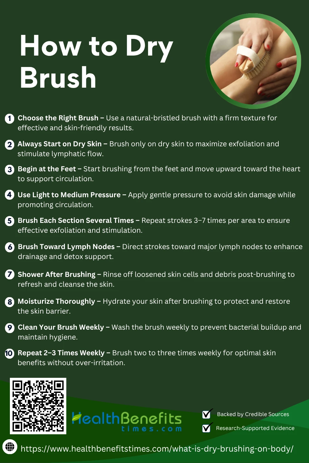 Dry brushing must be done on completely dry skin to maximize its exfoliating and circulatory effects. Brushing damp or wet skin reduces friction, making exfoliation less effective and potentially irritating American Academy of Dermatology. Experts advise brushing before showering for best results Cleveland Clinic Recommendations. Dry application also helps stimulate superficial lymphatic vessels more efficiently NIH lymphatic care research. (2)