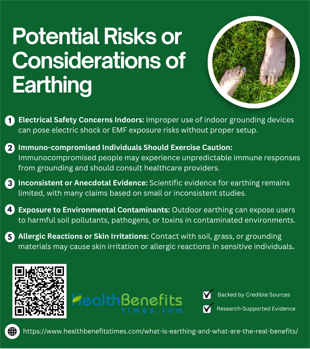 While earthing offers health benefits, it’s important to consider potential risks such as electrical hazards, allergies, or skin irritation—especially when using grounding devices or spending extended time outdoors.