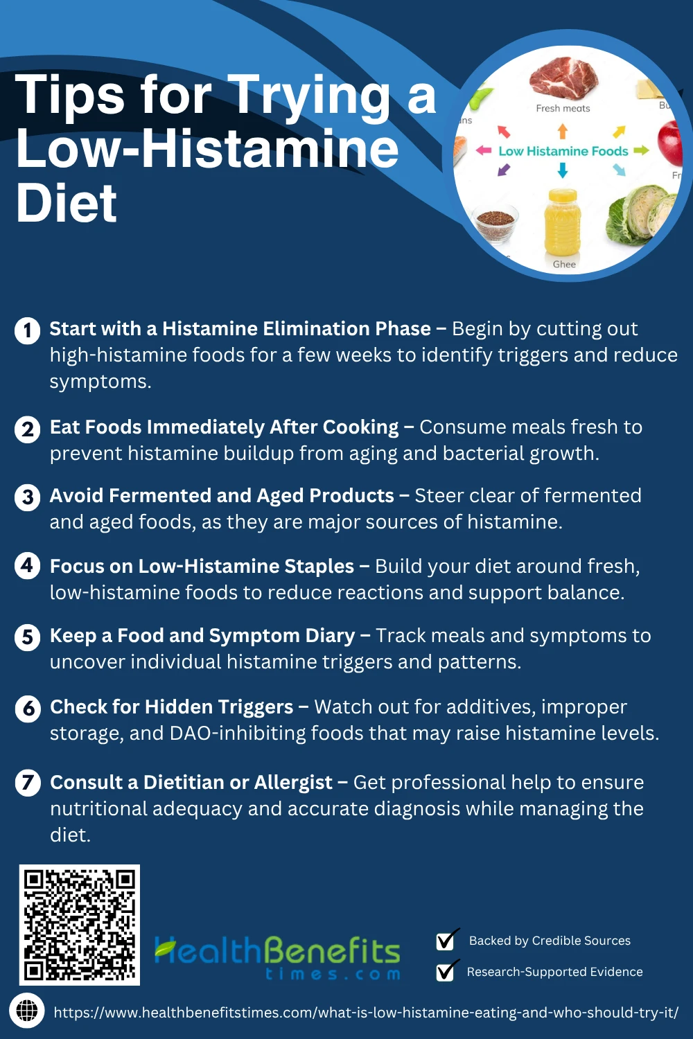 - Low-histamine eating involves avoiding foods high in histamine to manage symptoms like headaches, rashes, and digestive issues.