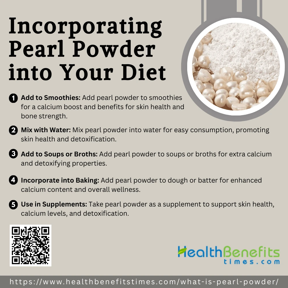 To incorporate pearl powder into your diet, mix 1/4 tsp into water, stir well, and drink. This method allows you to easily consume the powder, offering benefits such as improved skin health and detoxification. For an enhanced experience, you can also add the powder to smoothies, malts, or oatmeal. (26) Pearl powder is generally considered safe to consume and beneficial for overall wellness. (1)