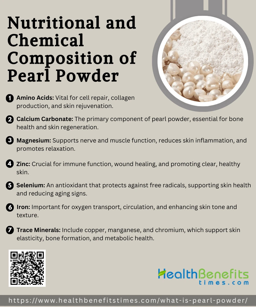 Pearl powder is a nutrient-rich substance, prized for its high mineral content, amino acids, and proteins. Its unique chemical composition contributes to its health and beauty benefits, supporting skin, hair, and overall wellness.