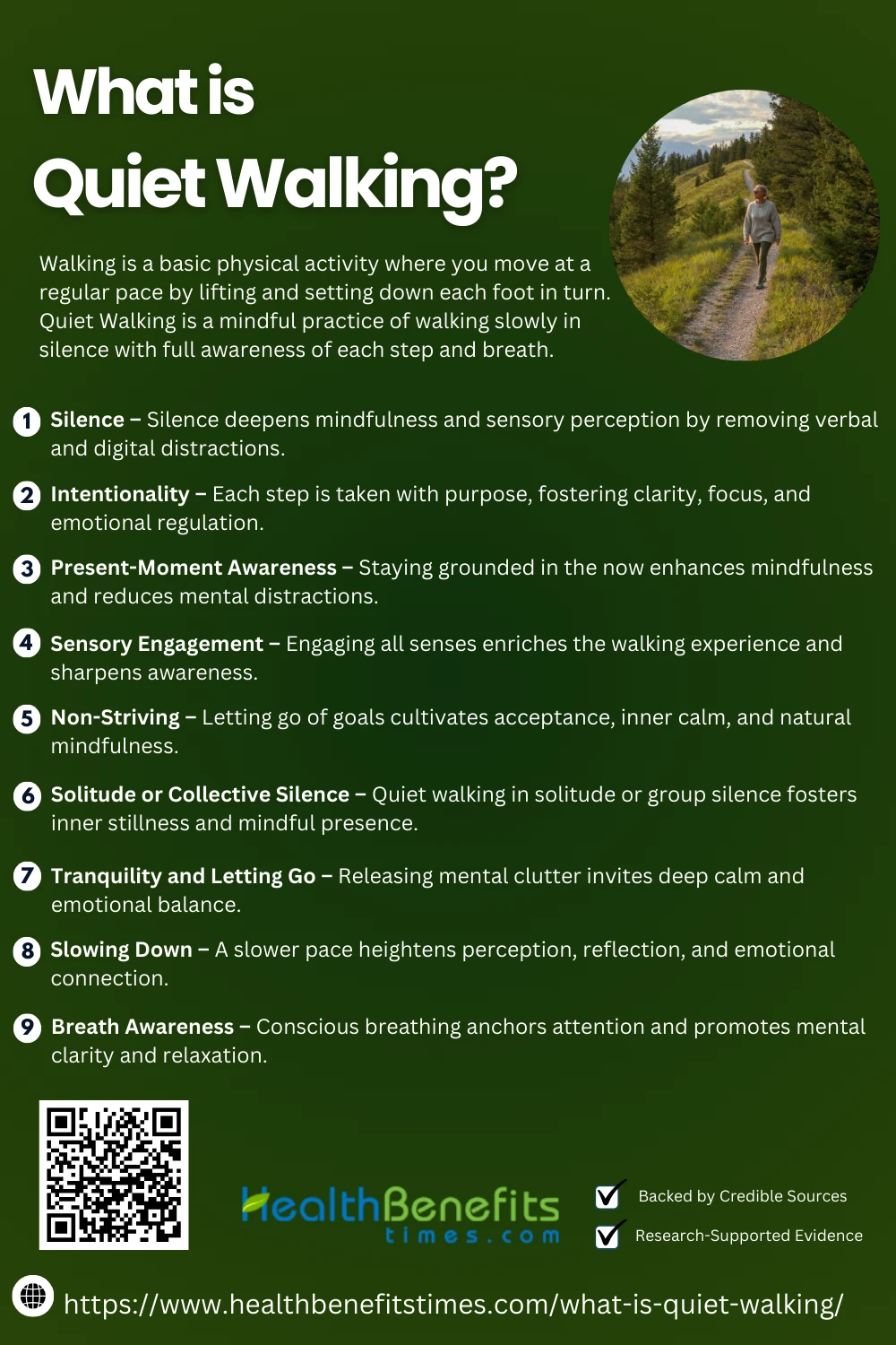 - Quiet Walking is a mindful practice of walking slowly in silence with full awareness of each step and breath.