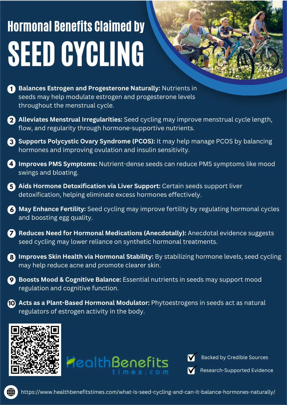 Seed cycling is said to help regulate hormones naturally, with claimed benefits including reduced PMS symptoms, improved menstrual regularity, enhanced fertility, and support for conditions like PCOS and menopause-related imbalances.