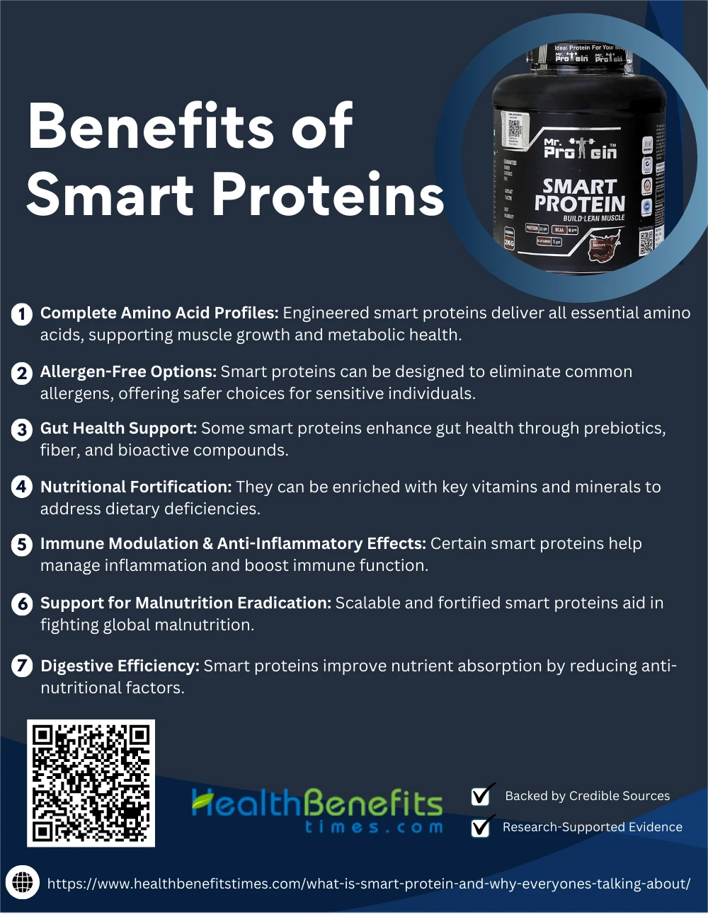 Smart protein offers numerous benefits, including improved health profiles, reduced environmental impact, and ethical production methods. It provides sustainable, nutrient-rich alternatives that support wellness, food security, and a greener future.