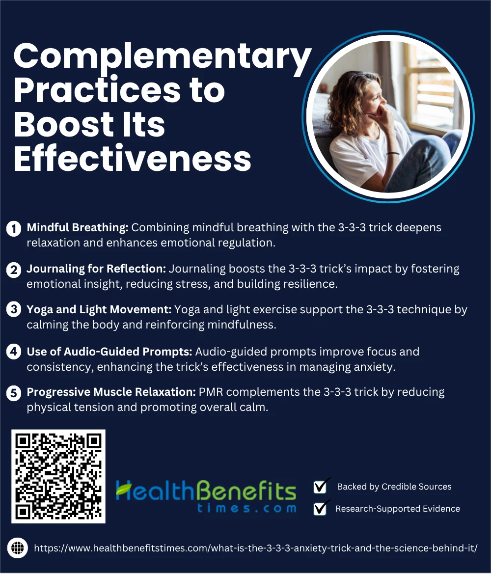 To enhance the effectiveness of the 3-3-3 anxiety trick, it helps to combine it with complementary practices like deep breathing, mindfulness, or physical activity for more comprehensive anxiety relief.