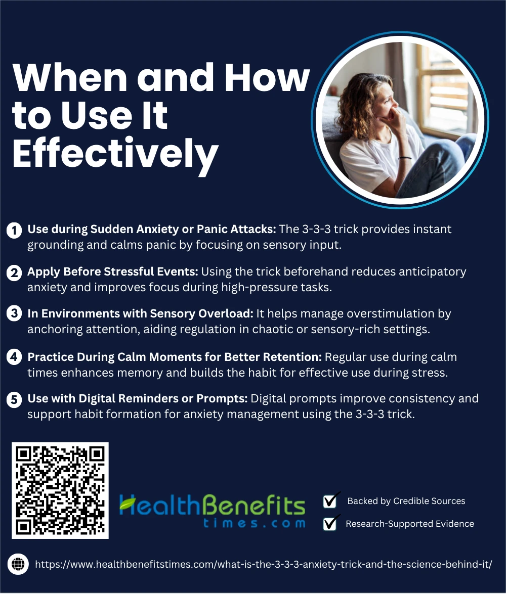 Knowing when and how to apply the 3-3-3 anxiety trick can make it more effective. It’s a practical tool to calm your mind during stress, panic, or overwhelming thoughts.