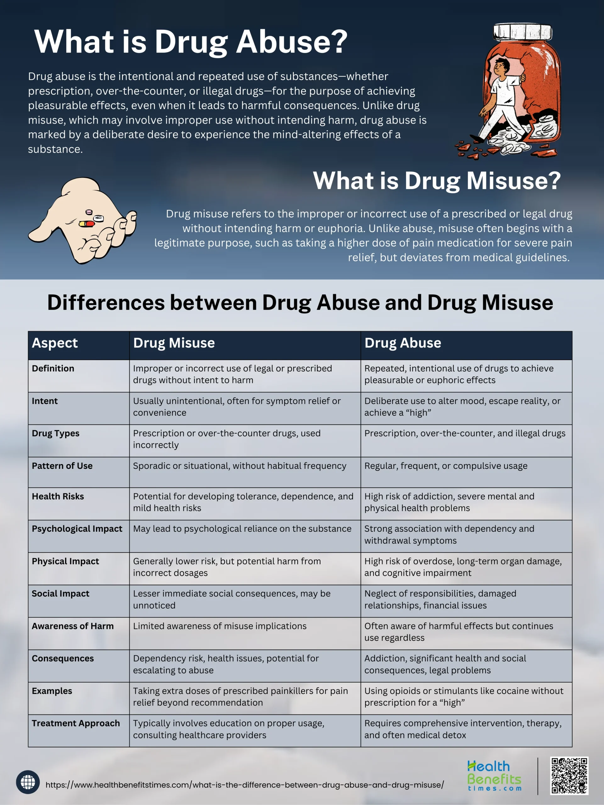 Recognizing the key differences between drug abuse and drug misuse helps in understanding the seriousness and consequences of each. Drug misuse typically involves taking a legal or prescribed drug in a manner other than directed, often without harmful intent but with potential for unintentional consequences. Drug abuse, on the other hand, is marked by intentional and repeated use of substances—whether legal or illegal—with the primary goal of experiencing mind-altering effects, often leading to significant health and social consequences. While misuse may stem from ignorance or neglect, abuse usually represents a deliberate choice that disregards health risks and social obligations.