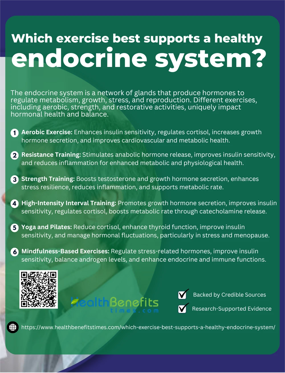 In conclusion, no single exercise universally supports the endocrine system; rather, a combination of aerobic, strength, and restorative activities works best to promote hormonal balance and overall health. Aerobic exercises enhance metabolism and insulin sensitivity, strength training boosts growth hormone and muscle health, while restorative practices like yoga reduce stress and regulate cortisol levels. By adopting a balanced exercise routine tailored to individual needs and ensuring proper rest, nutrition, and stress management, one can effectively support a healthy endocrine system and improve overall well-being.