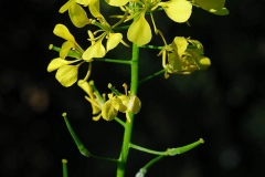 Flowers are yellow, bisexual about 1.5 long and 4-merous. Pedicel is 5-7 mm long. Sepals are 4, narrowly elliptical and 4-5 mm long. Petals four, obovate, 10 mm long and 4 mm wide narrowly clawed at base and are bright yellow. Stamens are 6, of which outer whorl of 2 shorter, inner whorls of 4 longer ones. Pistil is slightly shorter than longest stamens, ovary elongated, sessile and style ending in a semi-globose stigma. Gynoecium is fused in a single carpel. Flowering normally takes place in between June to August.