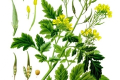 | Leaf | Pale green leaves of this plant are smooth, haphazardly dentate (having toothed margins), lyrately pinnate, rugged and have an uneven surface. Blade are elliptical, ovate or obovate in outline, up to 15 cm long, divided deeply or even to the midrib into 1-3 pairs of lobes with irregularly crenate or dentate margins. Uppermost stem leaves clearly lobed. Petiole is longest in largest leaves |