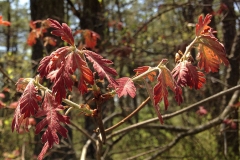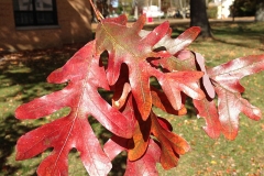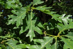 Alternate leaves occur along the twigs and young shoots. New leaves are pubescent, but they become hairless later. Mature leaves are 5 to 8.5 inches (13–22 cm) long and 2.75 to 4.5 inches (7.0–11.4 cm) wide they are broadly elliptic or obovate in outline and pinnatifid with 3-5 pairs of deep to medium lobes. The lobes have round tips and round sinuses; sometimes a few small secondary lobes are present. The upper surface of mature leaves is medium green and glabrous, while the lower surface dull light green or gray-green and hairless (or nearly so). The leaf bases are narrow and wedge-shaped (cuneate). The petioles are ¼-¾ inch long; light green to yellow, and glabrous. Because of the short petioles and their stiff texture, the leaves are resistant to fluttering in the wind. They usually turn red or brown in autumn, but depending on climate, site, and individual tree genetics, some trees are nearly always red, or even purple in autumn. Some brown, dead leaves may remain on the tree throughout winter until very early spring. The lobes can be shallow, extending less than halfway to the midrib, or deep and somewhat branching.