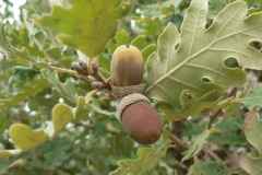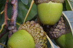 Fertile female flowers are replaced by acorns that become mature by the fall. Mature acorns are ½-1 inches long, consisting of a shallow cap and a nut. The cap is light tan or light gray with warty scales; it extends downward to about one-fourth the length of the acorn. The nut exterior is greenish brown to light brown, ovoid in shape, and glabrous, while the meat of the nut is white and usually slightly bitter.
