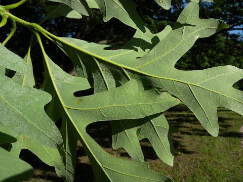 Alternate leaves occur along the twigs and young shoots. New leaves are pubescent, but they become hairless later. Mature leaves are 5 to 8.5 inches (13–22 cm) long and 2.75 to 4.5 inches (7.0–11.4 cm) wide they are broadly elliptic or obovate in outline and pinnatifid with 3-5 pairs of deep to medium lobes. The lobes have round tips and round sinuses; sometimes a few small secondary lobes are present. The upper surface of mature leaves is medium green and glabrous, while the lower surface dull light green or gray-green and hairless (or nearly so). The leaf bases are narrow and wedge-shaped (cuneate). The petioles are ¼-¾ inch long; light green to yellow, and glabrous. Because of the short petioles and their stiff texture, the leaves are resistant to fluttering in the wind. They usually turn red or brown in autumn, but depending on climate, site, and individual tree genetics, some trees are nearly always red, or even purple in autumn. Some brown, dead leaves may remain on the tree throughout winter until very early spring. The lobes can be shallow, extending less than halfway to the midrib, or deep and somewhat branching.