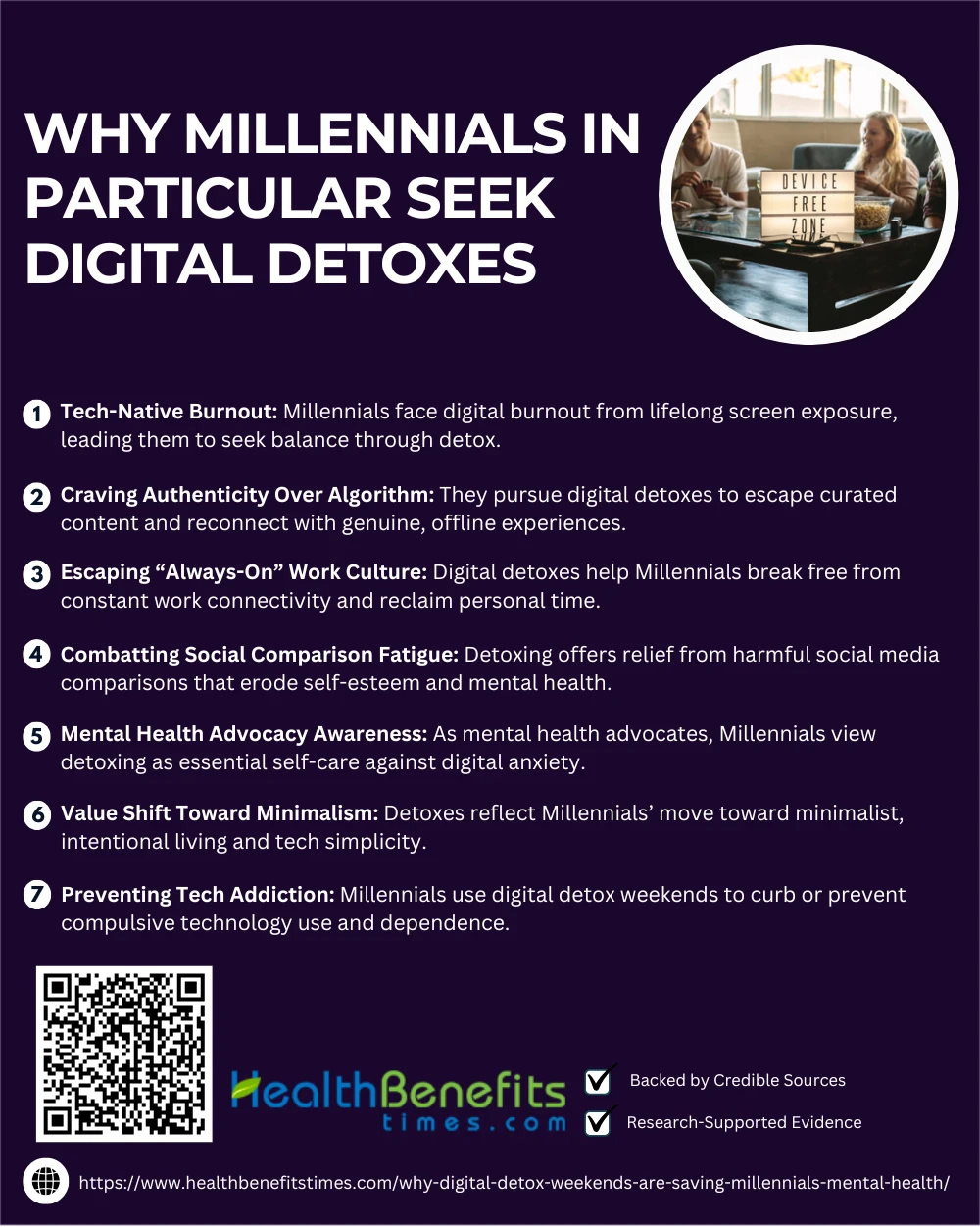 Millennials often seek digital detoxes due to constant connectivity, work-life imbalance, and social media pressure. Escaping screens helps them regain focus, reduce anxiety, and restore their mental and emotional health.