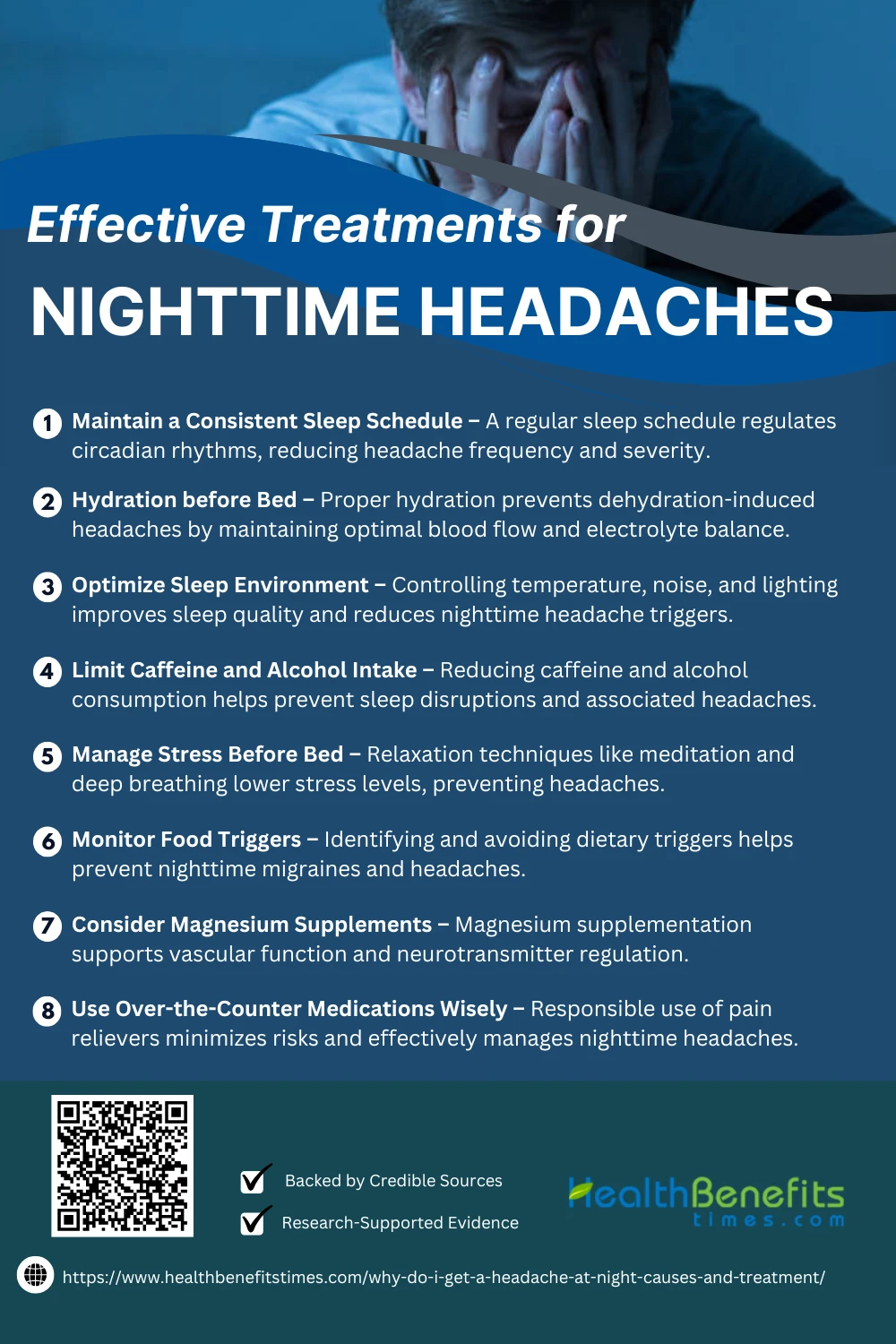 Maintaining a consistent sleep schedule has been shown to reduce the frequency and severity of nighttime headaches by regulating the body’s circadian rhythms. (70✔) Research suggests that irregular sleep patterns contribute to stress and hormonal imbalances, which can trigger headaches during the night. Studies also indicate that stable sleep habits improve melatonin production, promoting deeper sleep and reducing headache risk. Furthermore, individuals with chronic headaches who follow a structured sleep routine report fewer disruptions and lower headache intensity. (71✔)