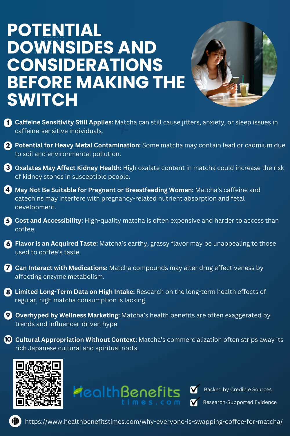 While matcha has many advantages, it’s not without its drawbacks. Before replacing your coffee habit, consider potential issues like cost, taste preferences, caffeine sensitivity, and quality differences in available products.