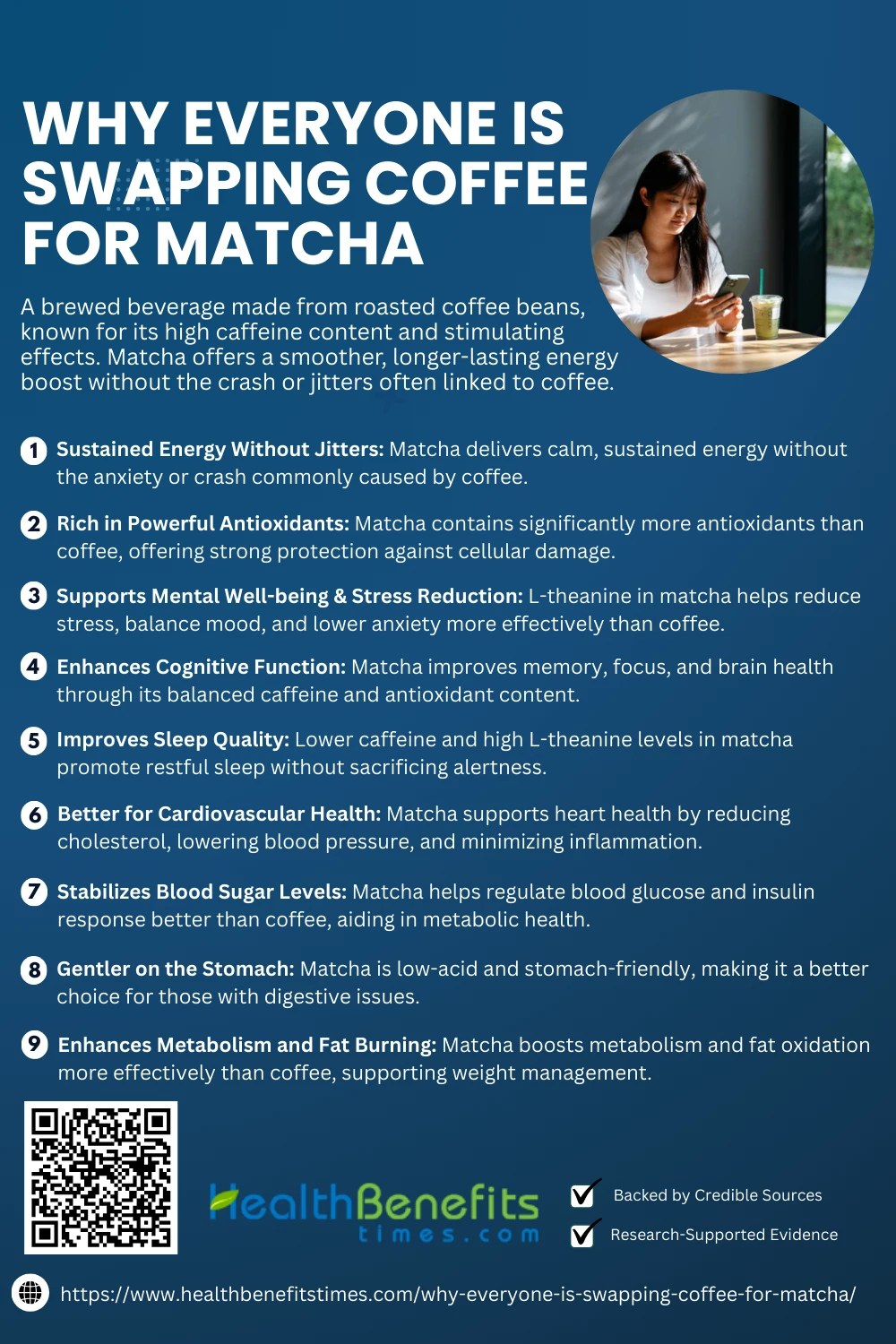 - Matcha offers a smoother, longer-lasting energy boost without the crash or jitters often linked to coffee.