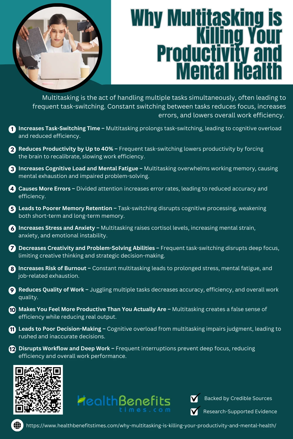 - Multitasking overwhelms the brain, causing stress, mental fatigue, and long-term cognitive strain.