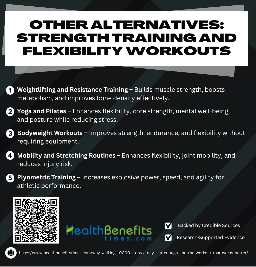 If you’re looking for alternatives beyond walking, strength training and flexibility workouts offer significant benefits. Here are five alternatives: