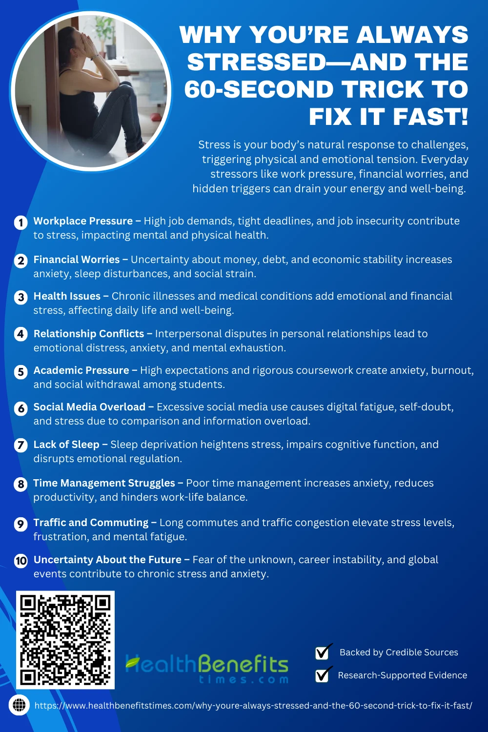 Stress has become a constant companion in modern life, fueled by work pressure, financial worries, digital distractions, and hidden triggers like poor breathing habits and muscle tension. When stress accumulates, it affects your mental clarity, mood, and physical health. Fortunately, there’s a simple 60-second trick that can provide instant relief—deep breathing using the 4-7-8 technique. This scientifically backed method activates your body’s relaxation response, lowering cortisol levels and calming your nervous system. By incorporating this quick fix into your routine, you can regain focus, reduce anxiety, and improve overall well-being in just a minute. Try it now!