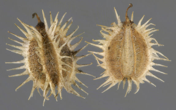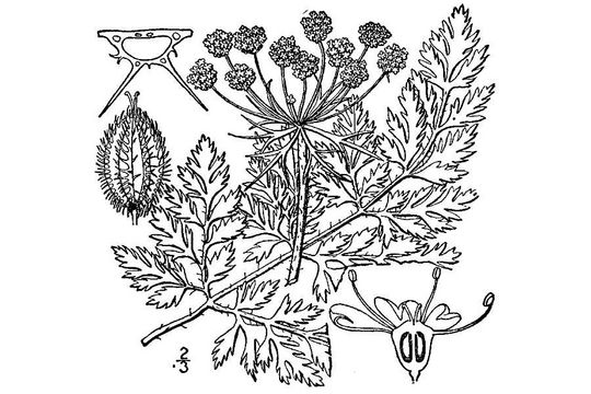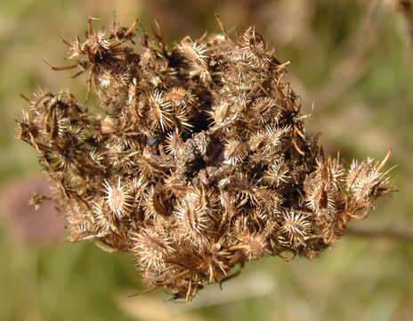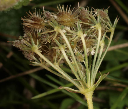 Afterwards, the flowers are replaced by 2-seeded fruits (schizocarps) that are about 3-4 mm. long and 2 mm. across; they are broadly ellipsoid, slightly flattened, reddish, and quite bristly. Seeds are yellowish brown to gray, flat on one side, and convex on the other side. Along the convex side of each seed, there are several longitudinal ribs with lines of bristles and stiff hairs.