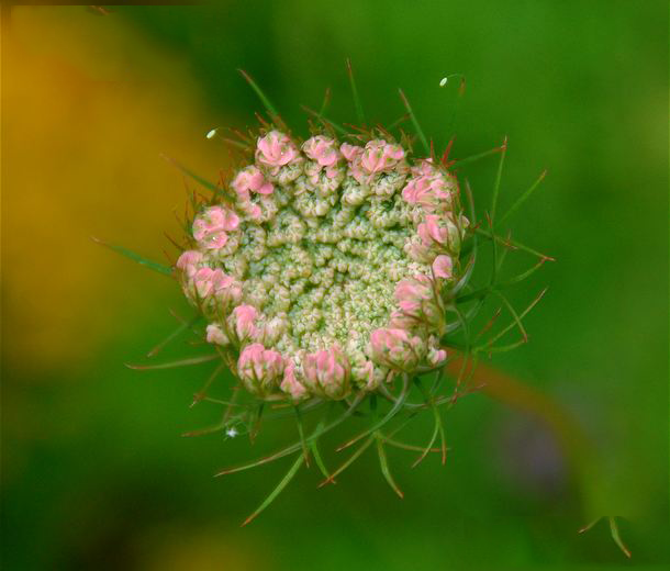 D. carota was introduced and naturalized in North America, where it is often known as “Queen Anne’s lace”. Anne, Queen of Great Britain, and her great grandmother Anne of Denmark are taken to be the Queen Anne for which the plant is named. It is so called because the flower resembles lace; the red flower in the center is thought to represent a blood droplet where Queen Anne pricked herself with a needle when she was making the lace. The function of the tiny red flower, colored by anthocyanin, is to attract insects. The herb consists of beta-carotene and other properties that are used to treat bladder and kidney conditions.
