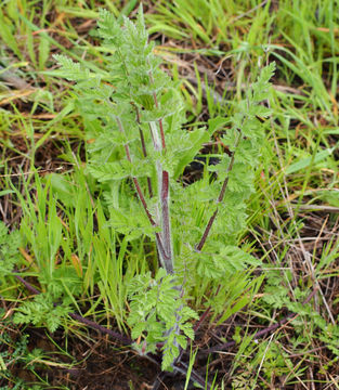Leaves are bipinnate-pinnatifid or pinnate-bipinnatifid in structure; their ultimate leaf segments are 3-10 mm. long, 1-4 mm. across, oblong-linear or narrowly rhombic in shape, and sometimes sparsely ciliate along their margins. The upper surface of these leaf segments is light-medium green and glabrous, while the lower surface is light green and glabrous to sparsely hairy. Both stems and leaves are more or less clothed with stout coarse hairs.