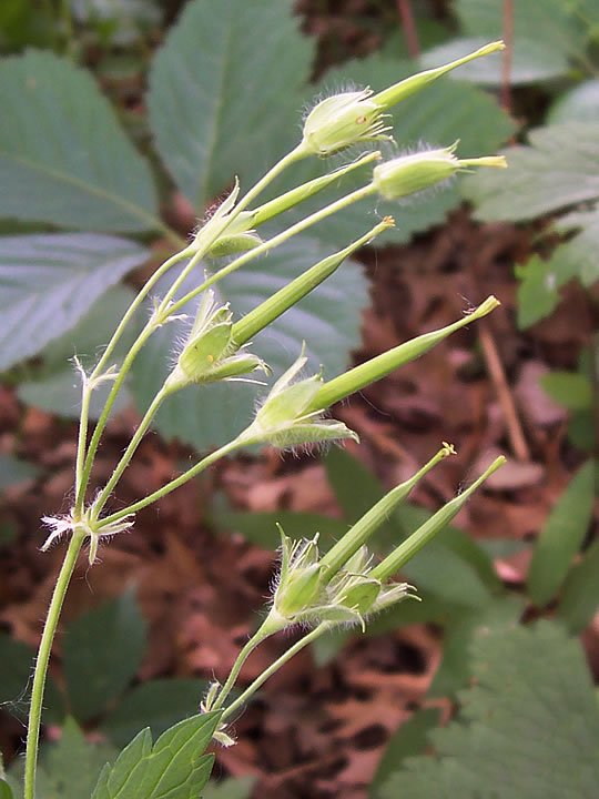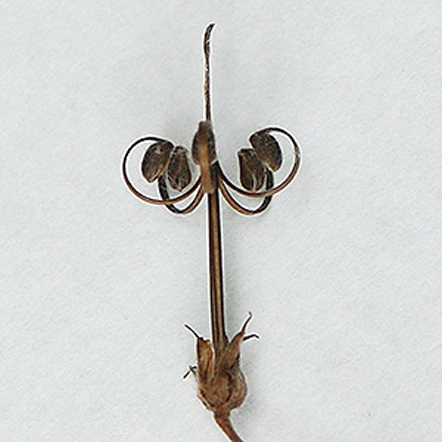 Flowers are followed by an erect beak-like seed capsule, covered with hair, develops at maturity. The capsule has five cells, each containing one seed and when mature, the outer carpels of the capsule curl backward to expose the seeds. The central stem then extends upward raising the 5 seeds, each then uncoiling its own spring-like stalk, with the remnants of the style held above them. The entire contraption resembles a wrought iron chandelier with five lamps. Each seed has long hairs attached and the coiled stalks have very short hairs.