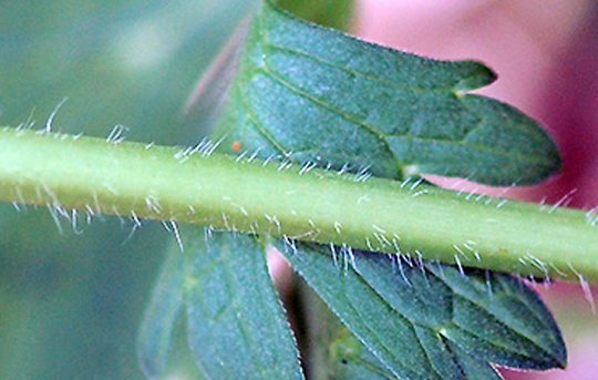The leaves are semi evergreen, opposite, palmately lobed with five or seven deeply cut lobes, 10–12.5 cm (4–5 in) broad, with a petiole up to 30 cm (12 in) long and pubescent with green to reddish color arising from the rootstock. They are deeply parted into three or five divisions, each of which is again cleft and toothed. The leaf margin is irregularly and coarsely toothed or cleft all around. Leaf surface is medium green and pubescent. Lower leaf surface has coarse white hairs like those on the petiole while the upper surface is covered with fine white hairs.